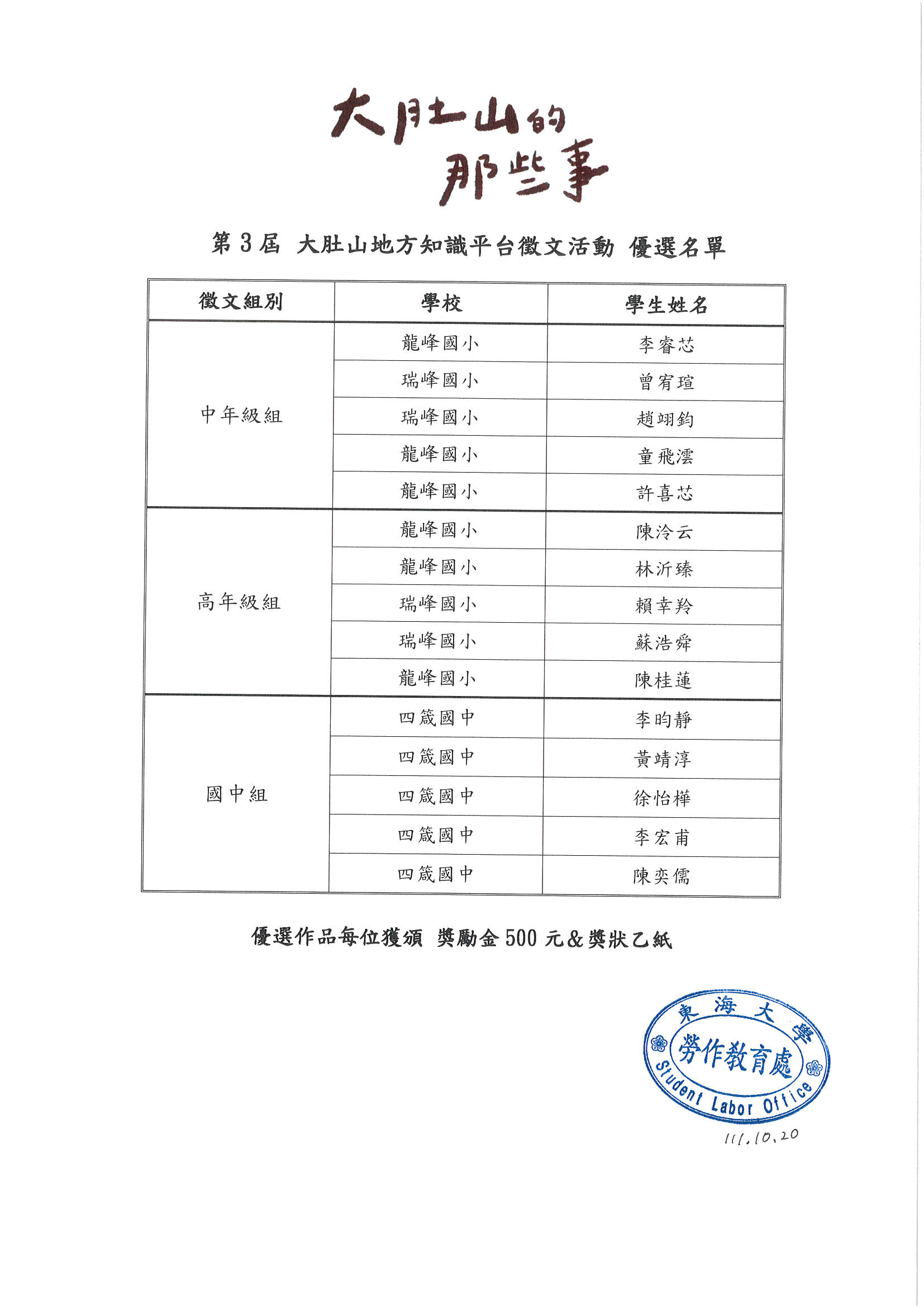 第3屆《大肚山的那些事》徵文活動佳作名單公告